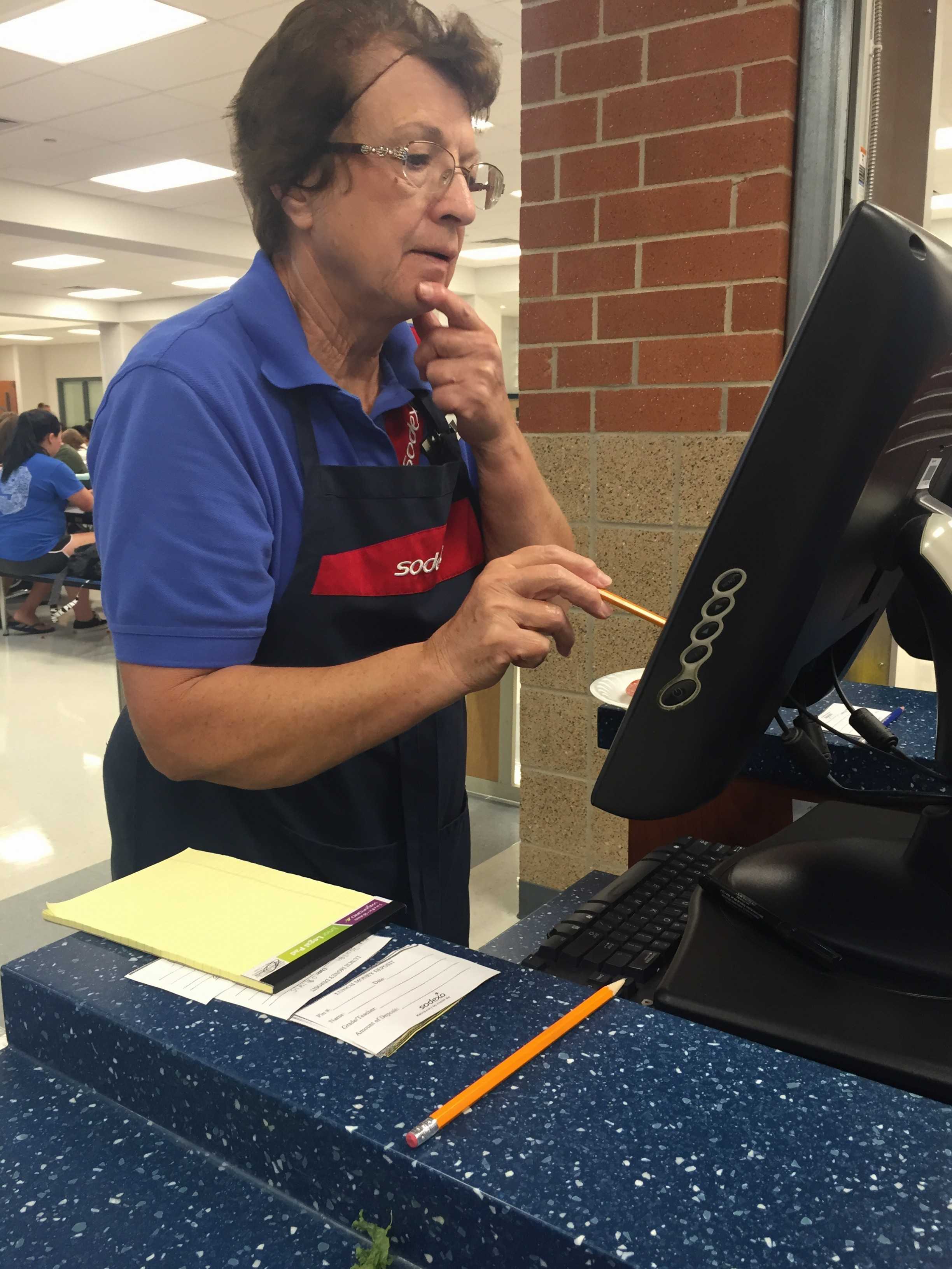 Cafeteria worker Beverly Jannin checks kids out in the lunch room, Aug. 18.